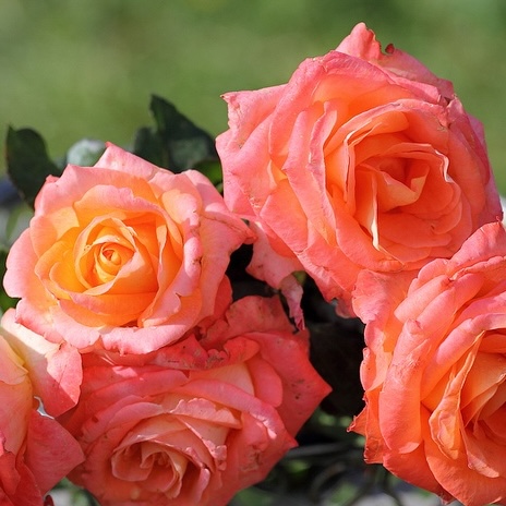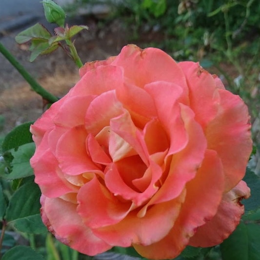 Una bella rosa al colorido anaranjado contrastado, sobre una planta sana y arbustiva.