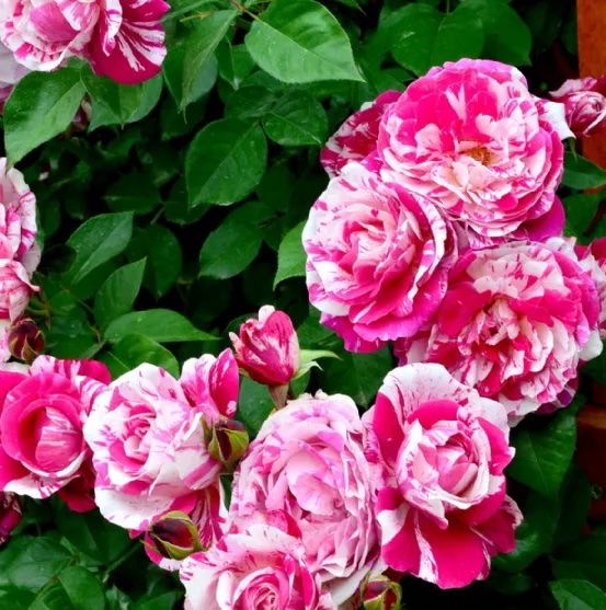 Rayas blancas y de color rosa intenso. Flores de color rojo violeta intenso veteadas de un rojo violeta más claro. Ninguno/no, fragancia de manzana. hasta 100 pétalos. Diámetro promedio 3,5 pulgadas. Mediano-grande, muy lleno (más de 41 pétalos), en pequeños racimos, con forma de flor redondeada, reflejada, ahuecada y en cuartos. Florece en oleadas durante toda la temporada.