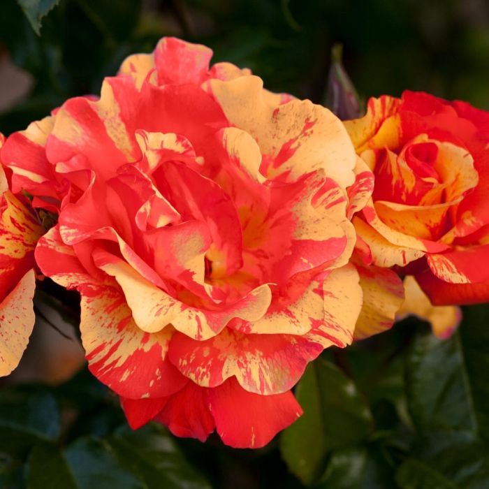 El rosal trepador Sorbet Fruite Meihestries tiene un color de flor único y soleado con vetas rojas y amarillas, lo que hace que este rosal trepador sea muy atractivo. Rosas con aproximadamente 35/45 pétalos Altura adulta de la rosa trepadora. de las rosas: 10 cm