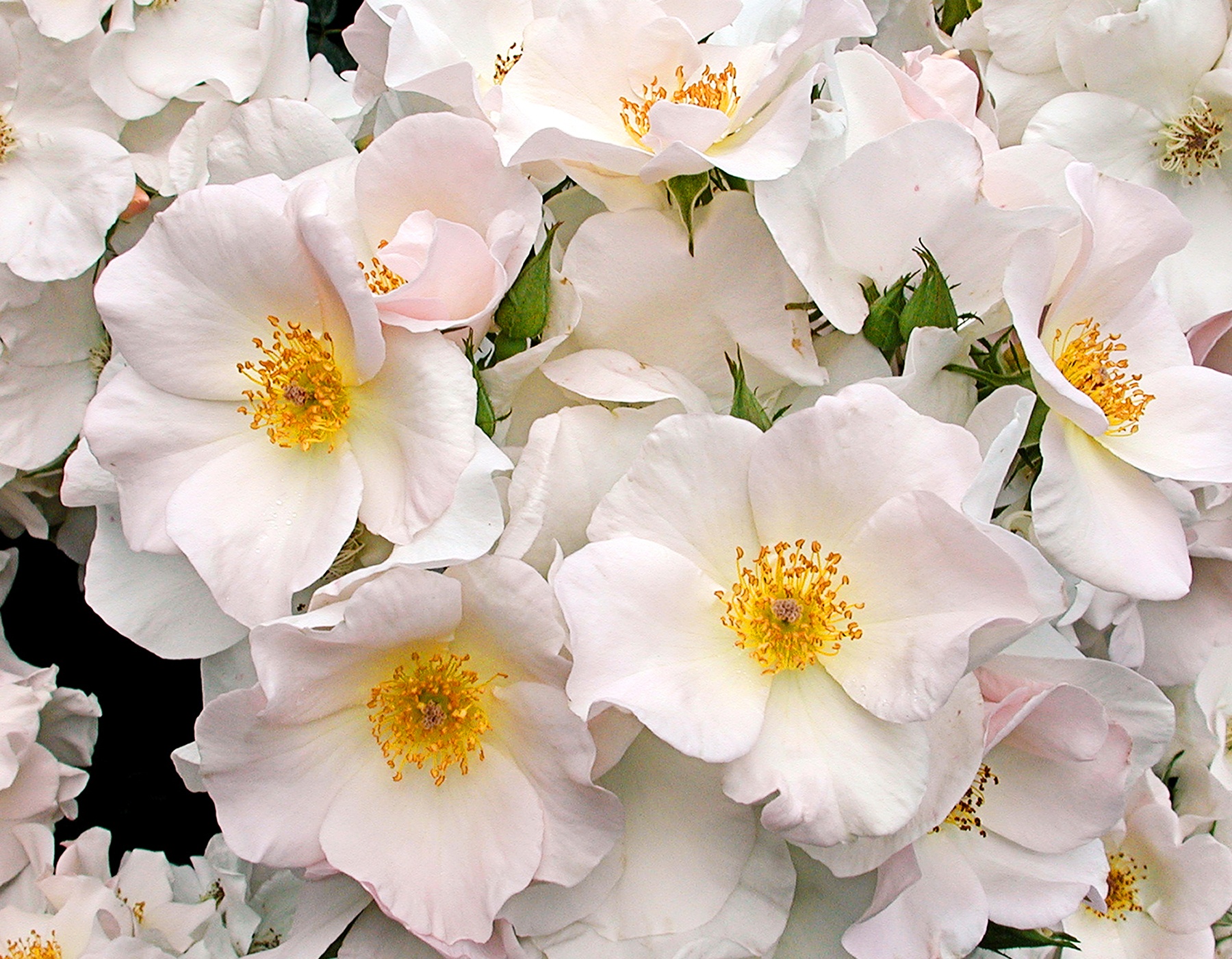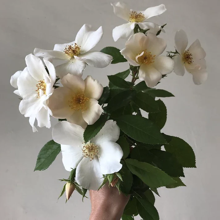 Una rosa con espléndidas ramas de flores blancas de un solo pétalo, más grandes en sus dimensiones individuales que otras rosas híbridas de almizcle. Un ramo de flores de Sally Holmes puede ser tan grande como una pelota de baloncesto. Puede ser cultivada como trepadora, pero necesita soportes en lugares ventosos. Las flores son grandes, de 10 a 12 cm de diámetro, y tienen una forma de pétalo único con 4-8 pétalos. Las flores se producen en racimos largos con tallos (10-40). Inicialmente, las flores son de color crema con matices rosados y estambres amarillos, que con el tiempo se vuelven blancas a medida que los estambres caen. Las flores duran mucho tiempo bajo la lluvia y en climas cálidos. La rosa tiene una fragancia suave con un follaje brillante de color verde oscuro. Un arbusto frondoso y recurrente de 152 cm de altura, que produce flores grandes de color blanco crema semidobles con una ligera fragancia. Estas pueden ser muy hermosas, pero las que se producen en los tallos principales fuertes tienden a estar demasiado cerca unas de otras, formando una cabeza de flor desgarbada. Cuando aparecen en las ramas laterales, es completamente diferente, ya que aquí tenemos menos flores que pueden mostrar su delicada elegancia a la perfección. Podría valer la pena cortar las cabezas más grandes antes de que florezcan para fomentar la ramificación. Los padres fueron Ivory Fashion × Ballerina. Criada por Holmes (Reino Unido), un exitoso criador aficionado, introducida en 1976.