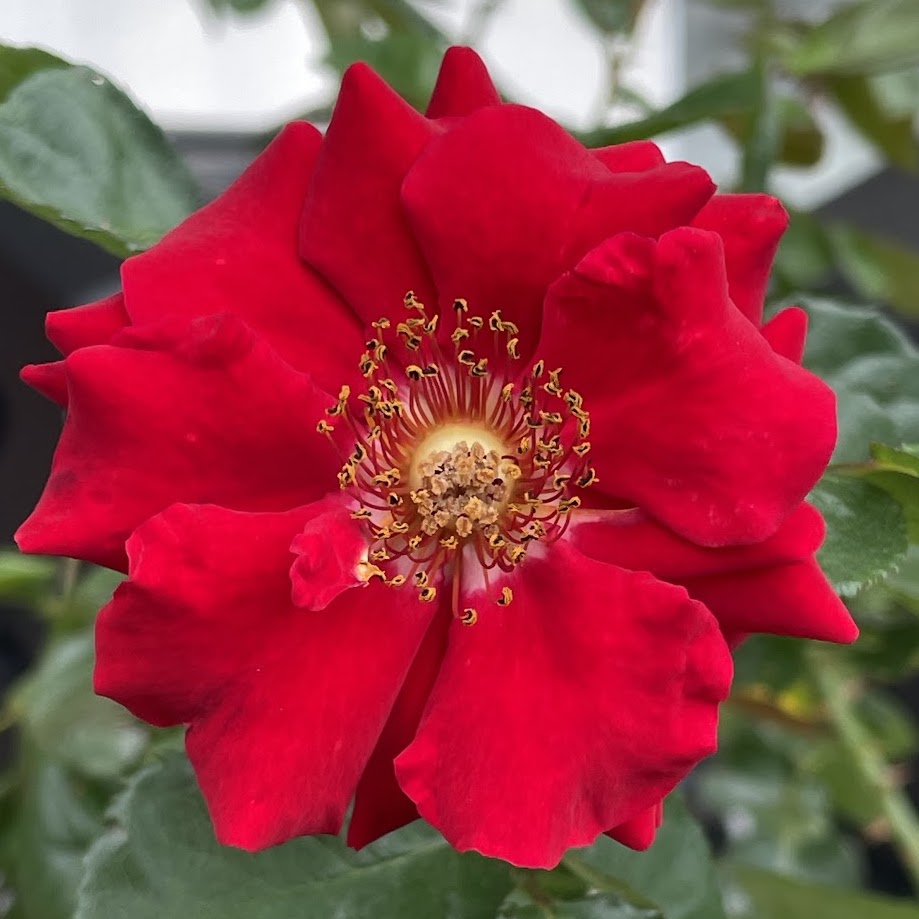 Sus delicadas flores de color naranja o rojo naranja. Fragancia moderada. Rosa de diámetro medio de aproximadamente 7.62 centímetros. 15 pétalos. La flor con forma amplia, semi doble de 9 a 16 pétalos, generalmente en flor solitaria. En pequeños grupos, capullos altos centrados. Florece en oleadas a lo largo de la temporada. La primavera o el verano son las épocas de máxima floración; si se le poda más tarde, tiene floraciones dispersas.