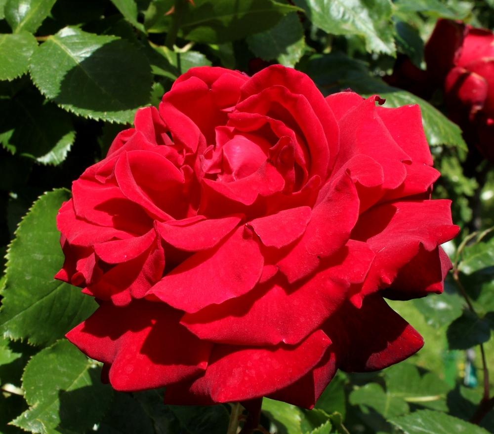 Rojo, reflejos rojo carmín, matices malva. (Rouge groseille). Fragancia fuerte. 30 pétalos. Diámetro promedio 5.5 pulgadas. Floración muy grande, doble (17-25 pétalos). Florece en brotes durante toda la temporada.